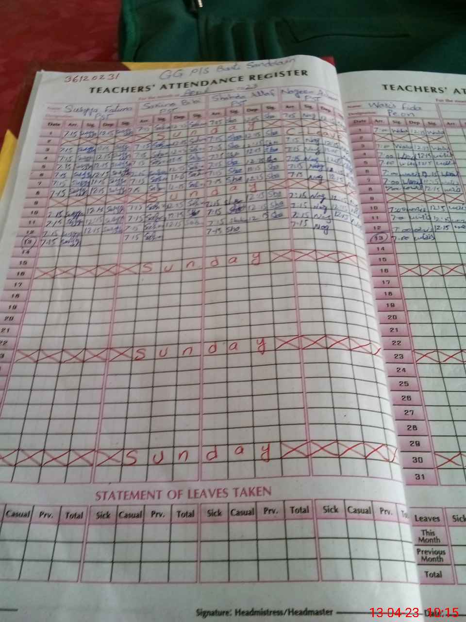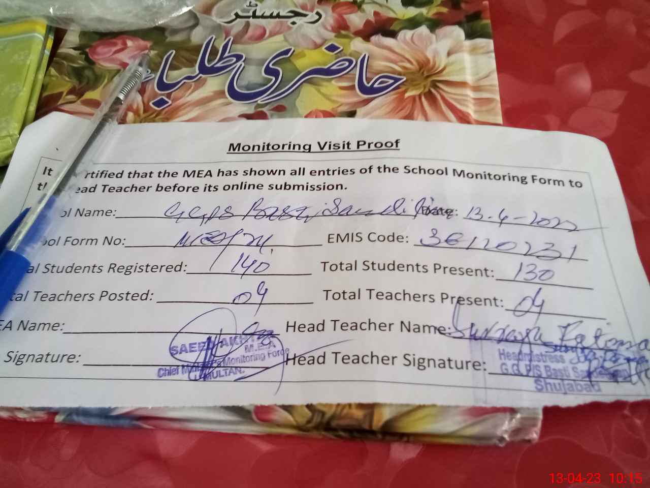| Attendance Register | Head Teacher | MEA with School | Visit Proof |
