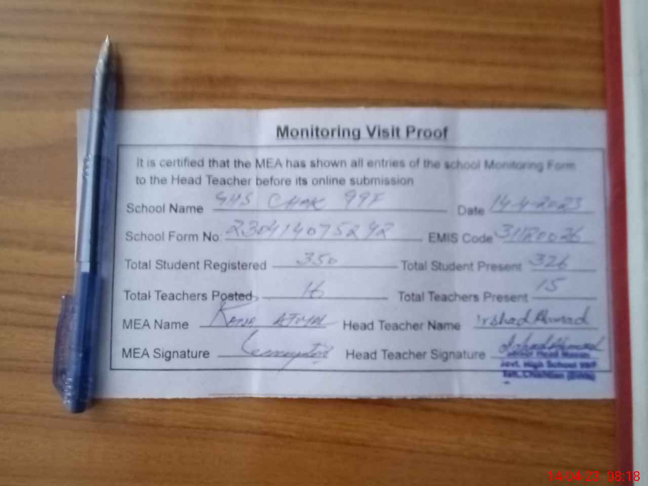 | EMIS Code: 31120026 | Name of School: GHS CHAK NO. 99/F | |||
