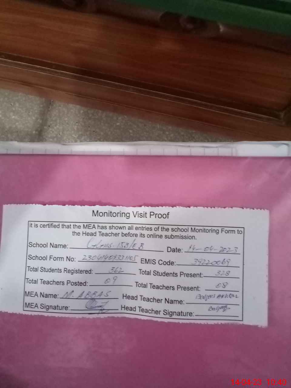 | Attendance Register | Head Teacher | MEA with School | Visit Proof |