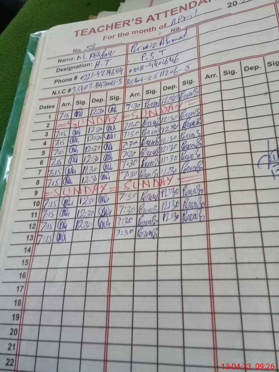 | Name: MAS**** Designation: (School Headmaster's/Headmistress's) PST Phone/Cell Number: 03**** |