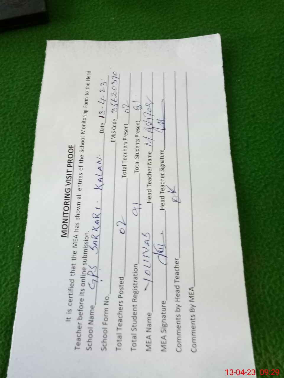 | Attendance Register | Head Teacher | MEA with School | Visit Proof |