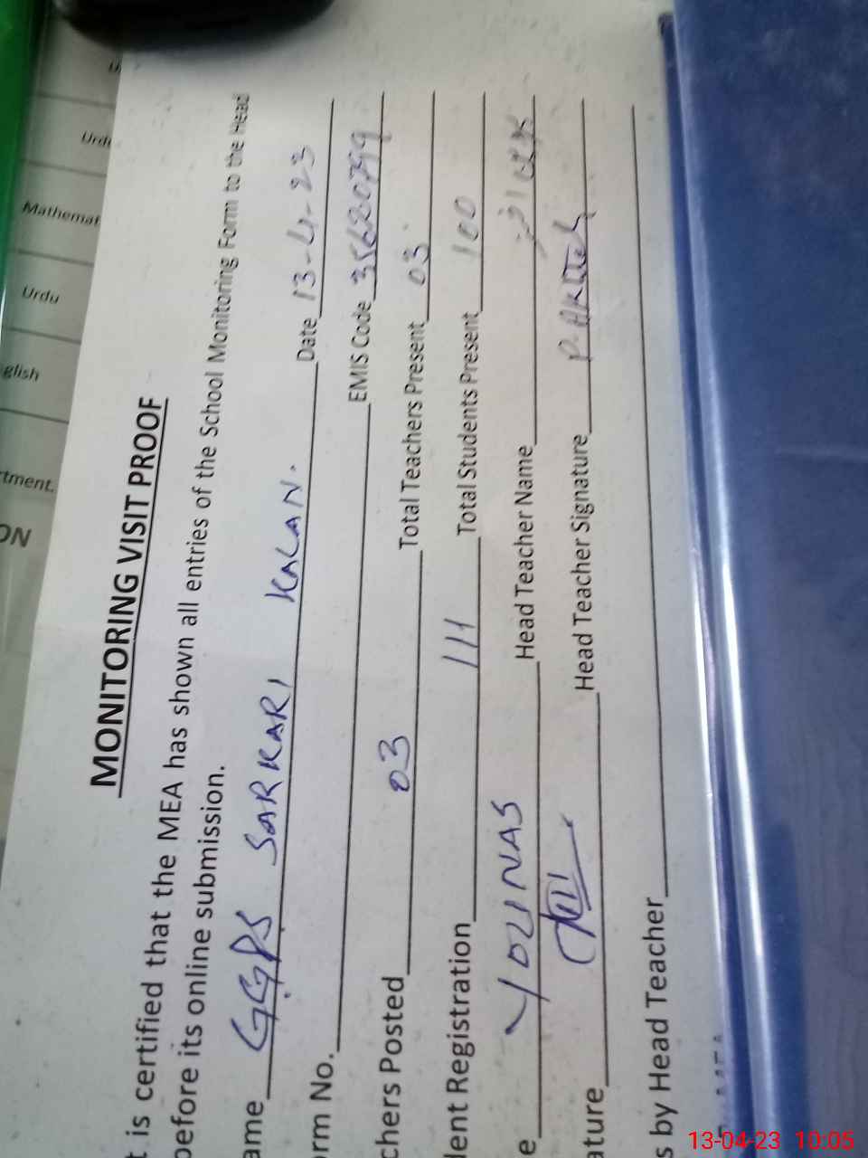 | Attendance Register | Head Teacher | MEA with School | Visit Proof |