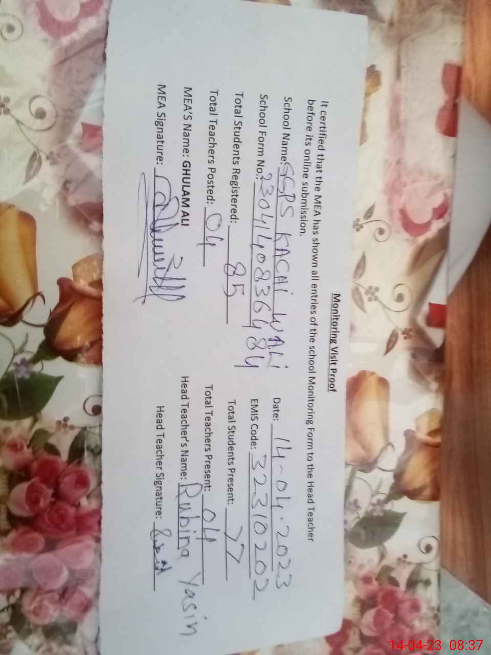 | Attendance Register | Head Teacher | MEA with School | Visit Proof |