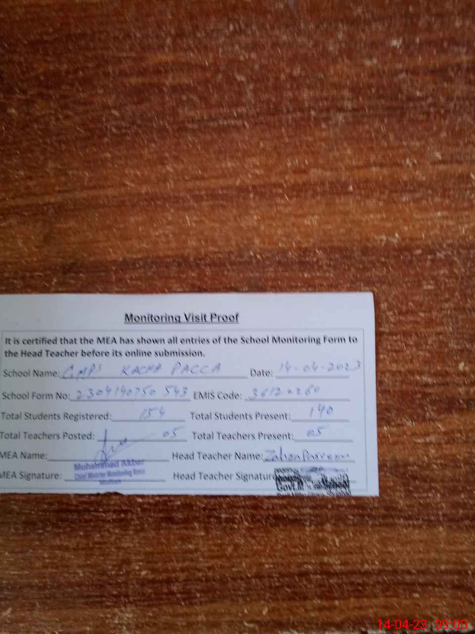| Attendance Register | Head Teacher | MEA with School | Visit Proof |