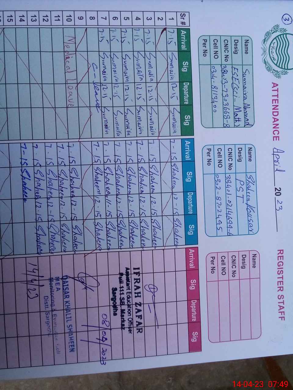 | CNIC | Full Name | Designation | R/C | Absence during last cal. month |