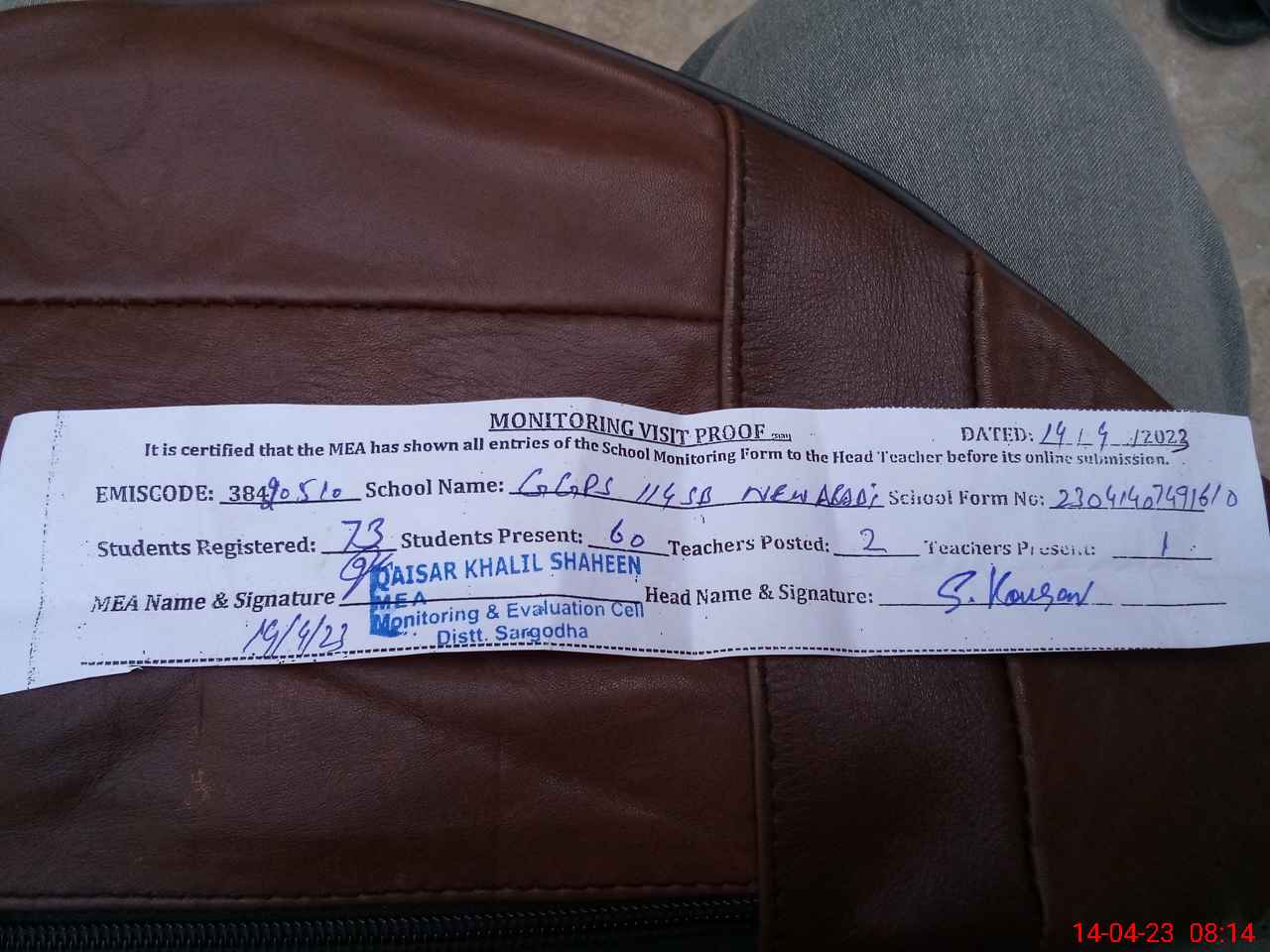| Attendance Register | Head Teacher | MEA with School | Visit Proof |