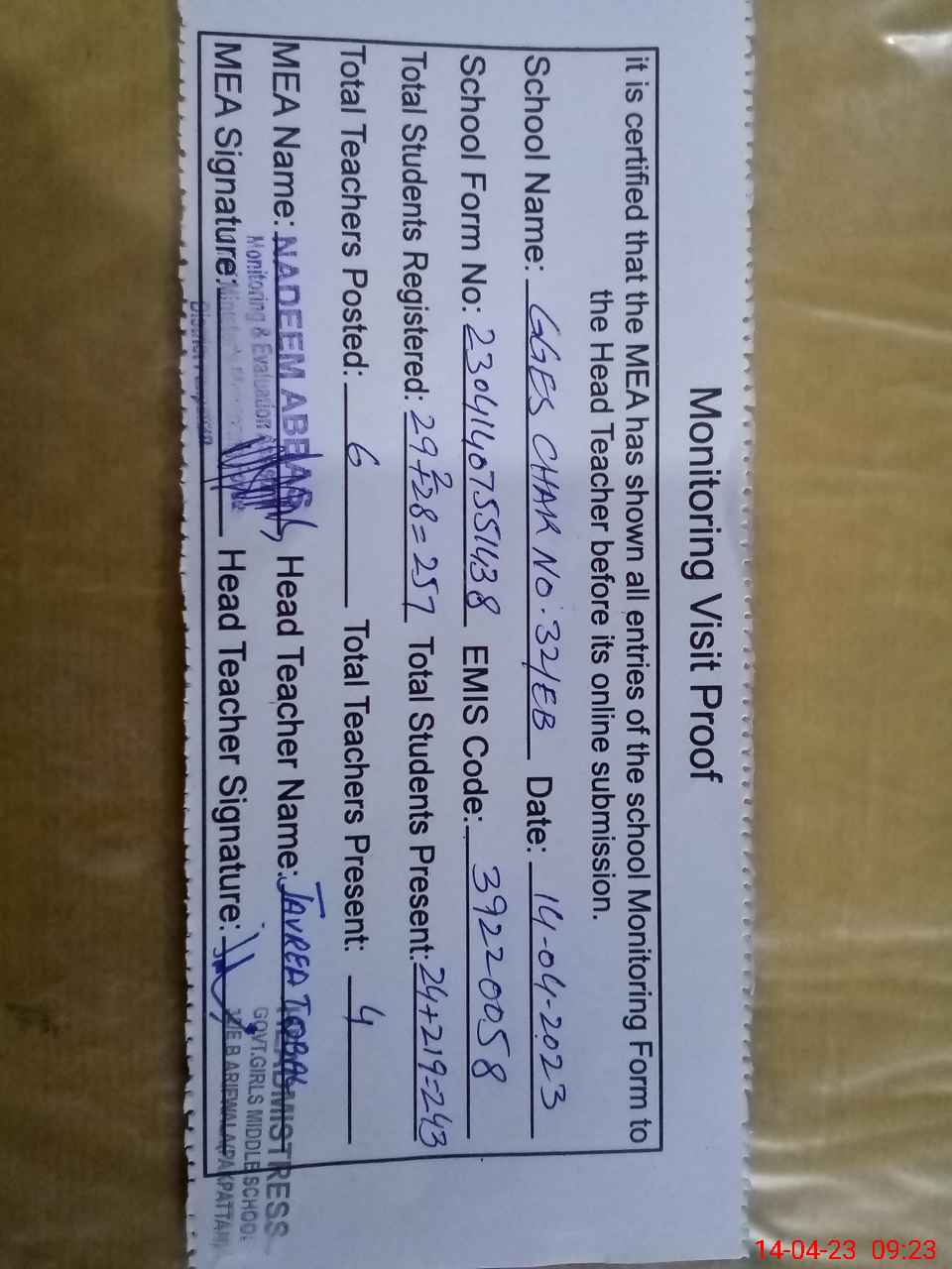 | Attendance Register | Head Teacher | MEA with School | Visit Proof |