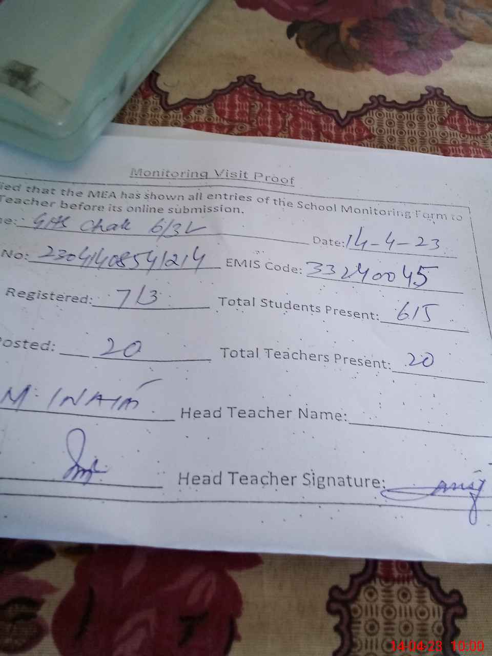 | EMIS Code: 33240045 | Name of School: GHS CHAK NO 6/3-L | |||