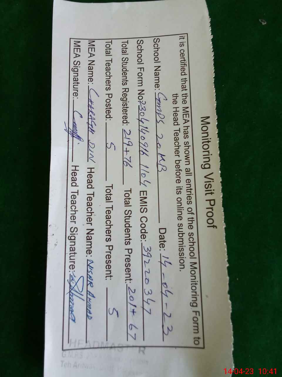 | EMIS Code: 39220347 | Name of School: GMPS CHAK NO. 20 KB | |||