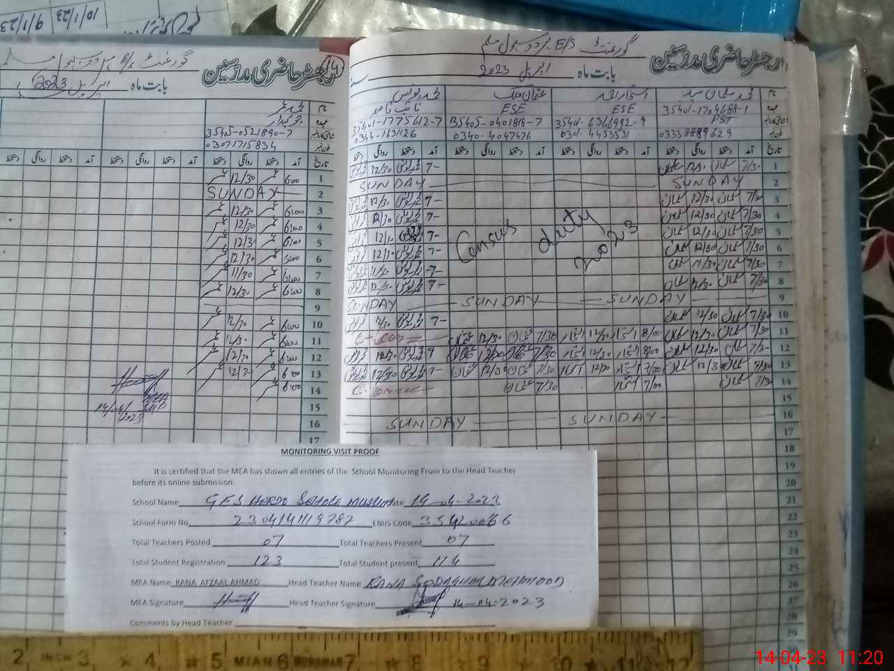 | Attendance Register | Head Teacher | MEA with School | Visit Proof |
