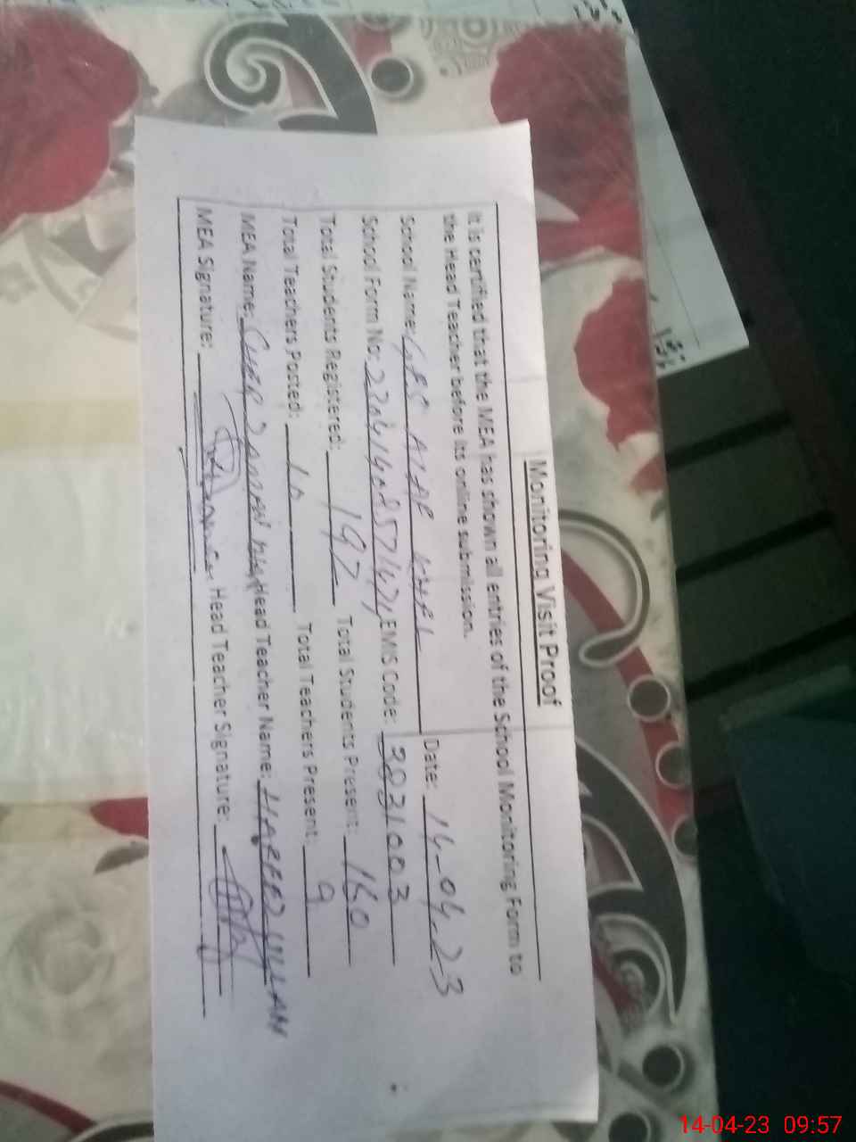 | Attendance Register | Head Teacher | MEA with School | Visit Proof |