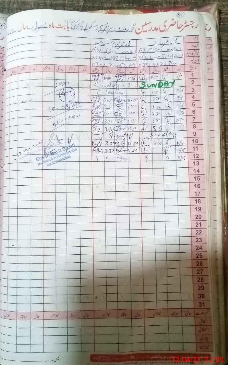 | Remarks (Use Separate Page if Required): Muhammad Adnan Sabir PST absent Afternoon School Program | |||||