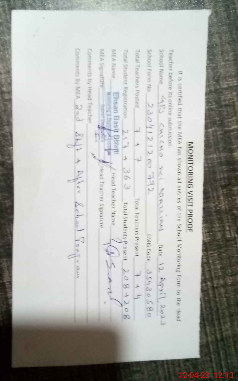 | Attendance Register | Head Teacher | MEA with School | Visit Proof |