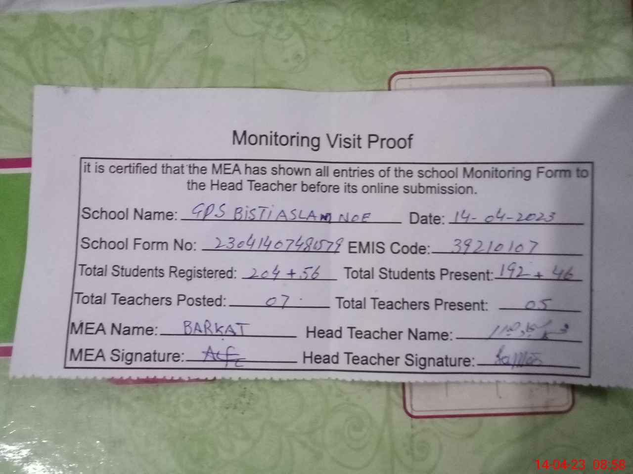 | Attendance Register | Head Teacher | MEA with School | Visit Proof |