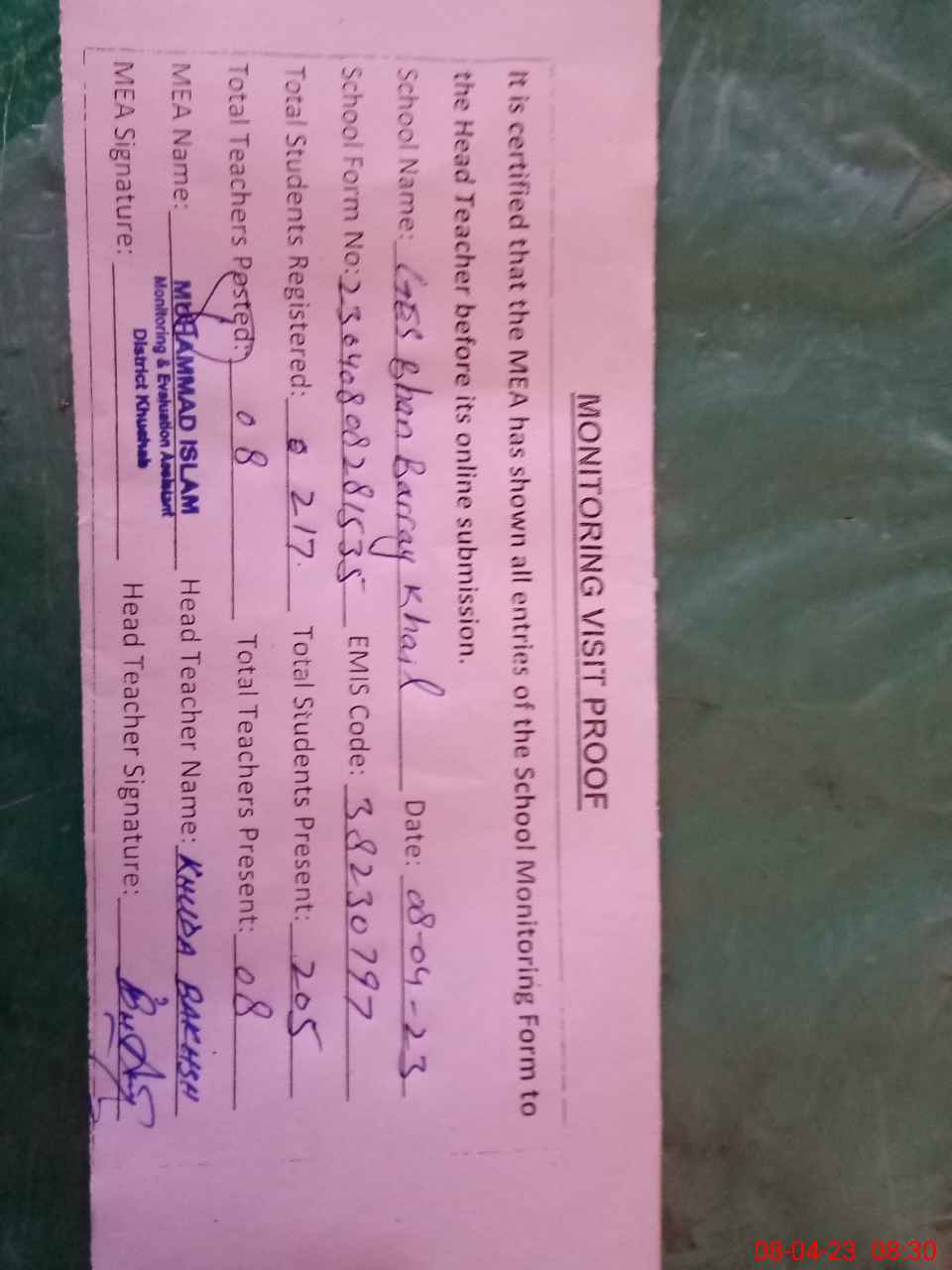 | Attendance Register | Head Teacher | MEA with School | Visit Proof |