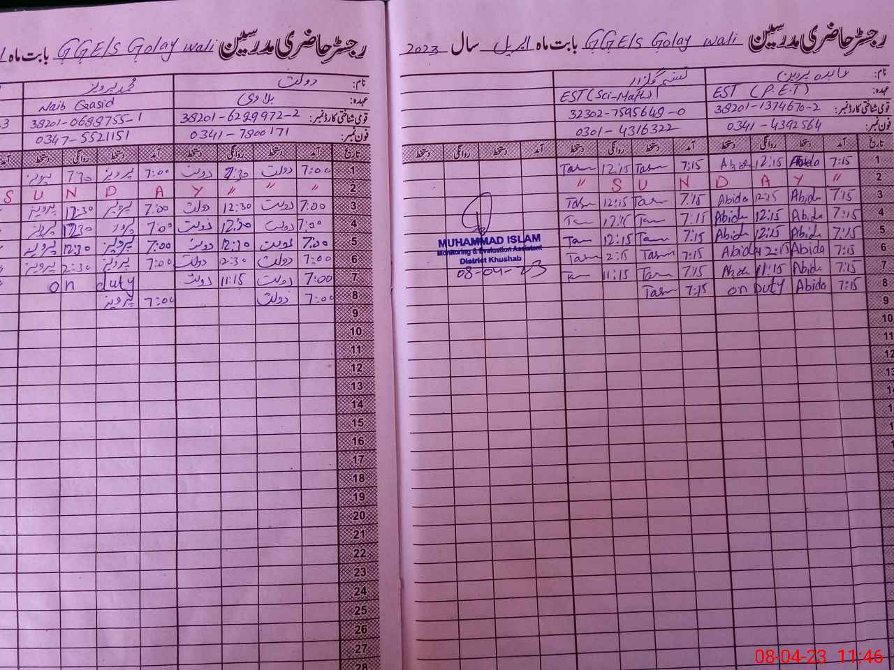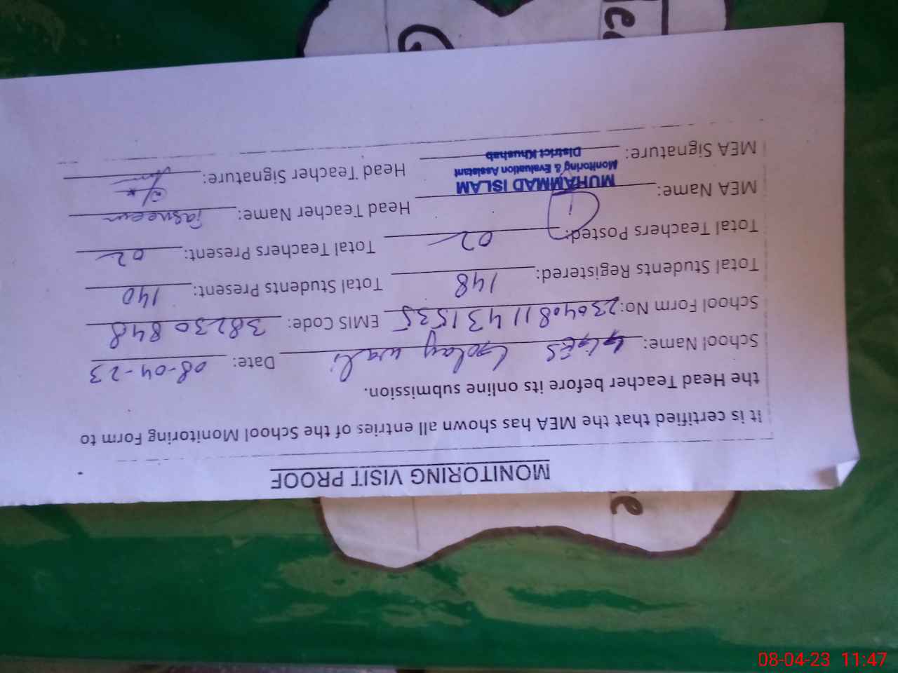 | Attendance Register | Head Teacher | MEA with School | Visit Proof |