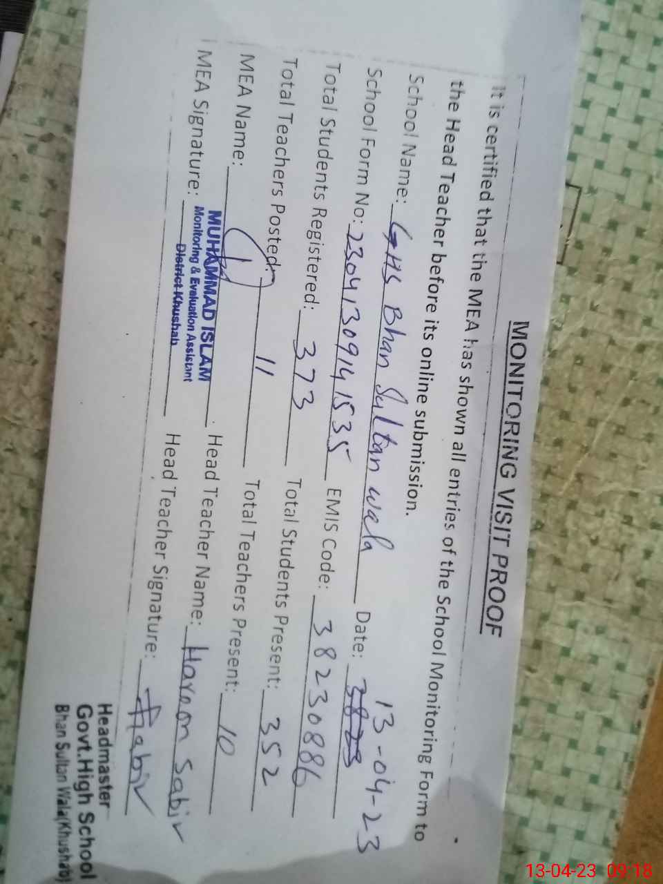 | EMIS Code: 38230886 | Name of School: GHS BHAN SULTAN WALA KHUSHAB | |||