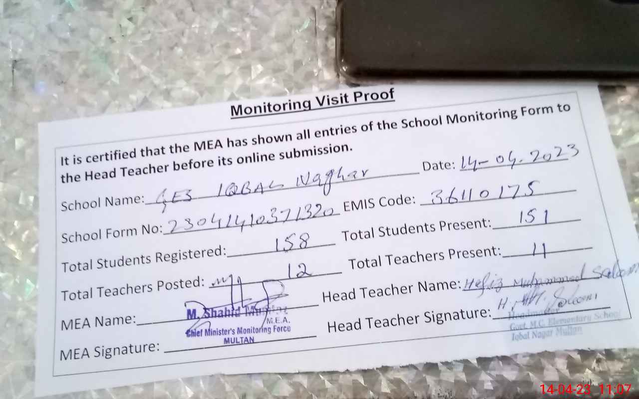 | EMIS Code: 36110175 | Name of School: GES MC IQBAL NAGAR | |||