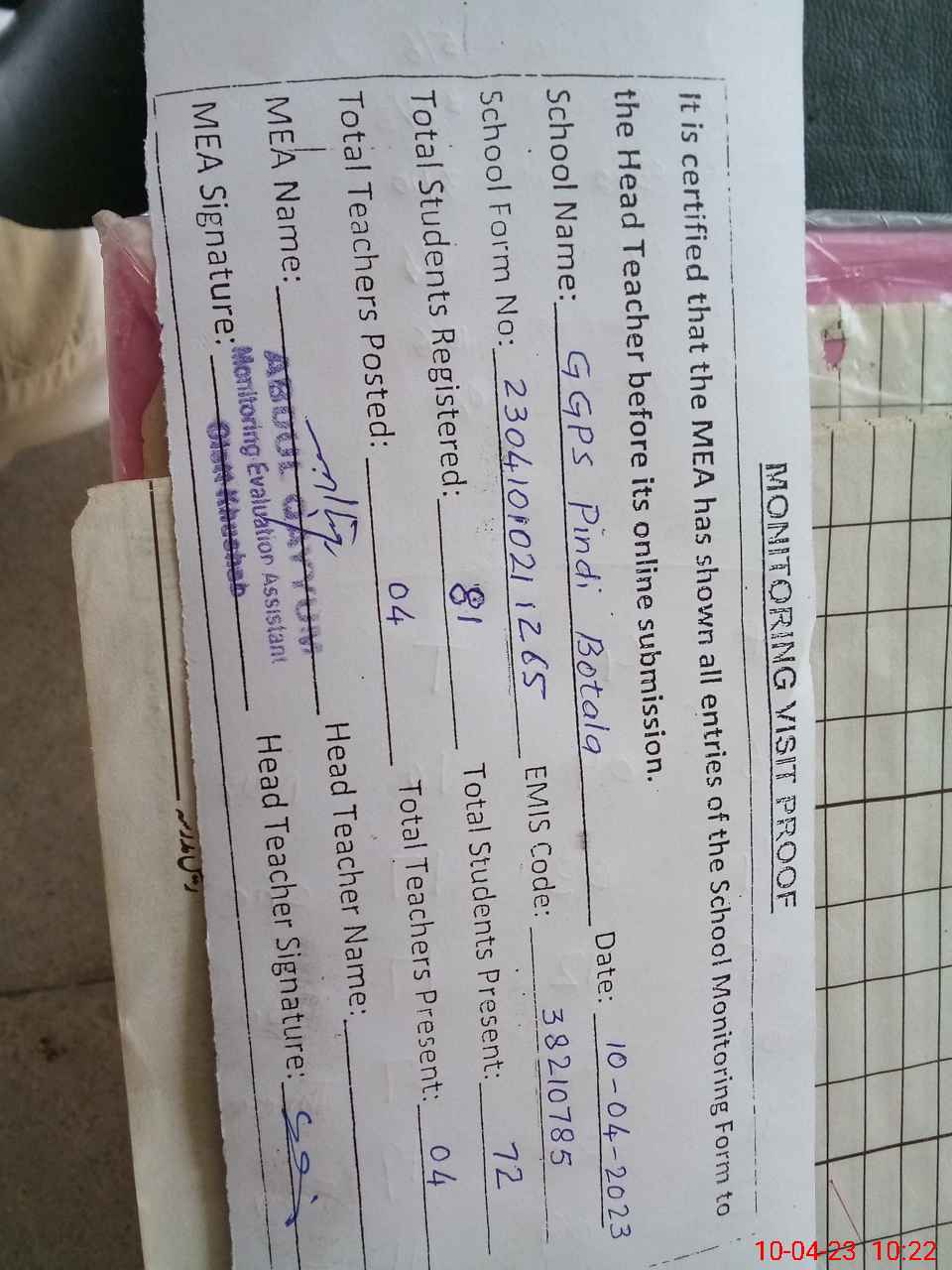 | EMIS Code: 38210785 | Name of School: GGPS PINDI BOTALA | |||