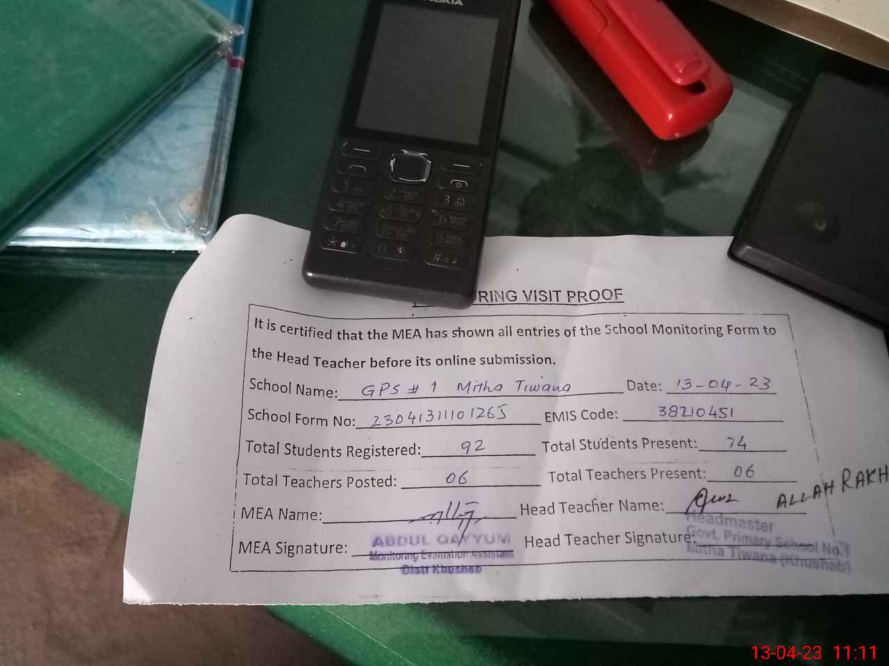| Attendance Register | Head Teacher | MEA with School | Visit Proof |