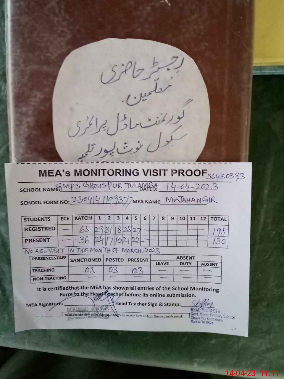 | Attendance Register | Head Teacher | MEA with School | Visit Proof |