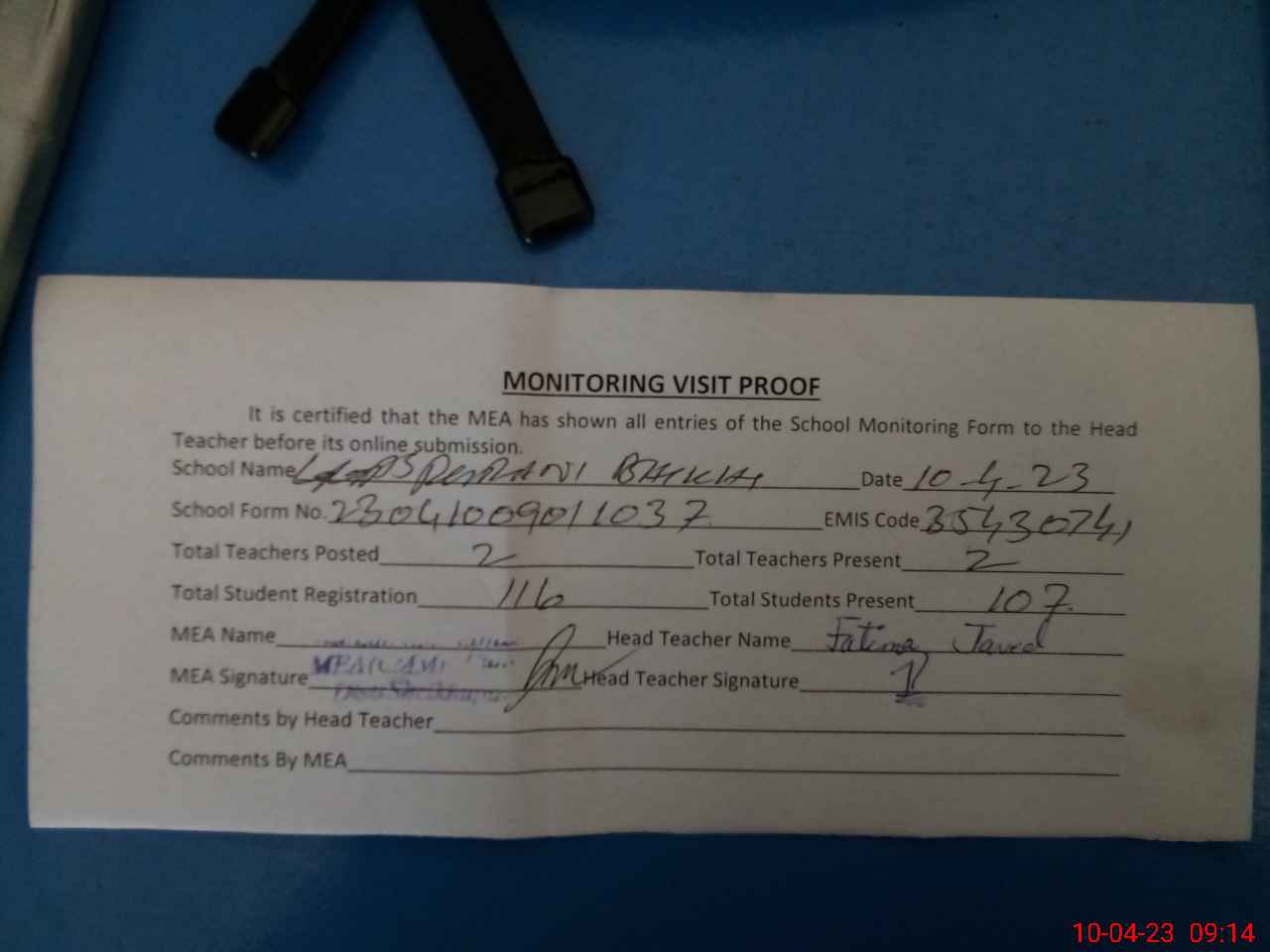 | Attendance Register | Head Teacher | MEA with School | Visit Proof |