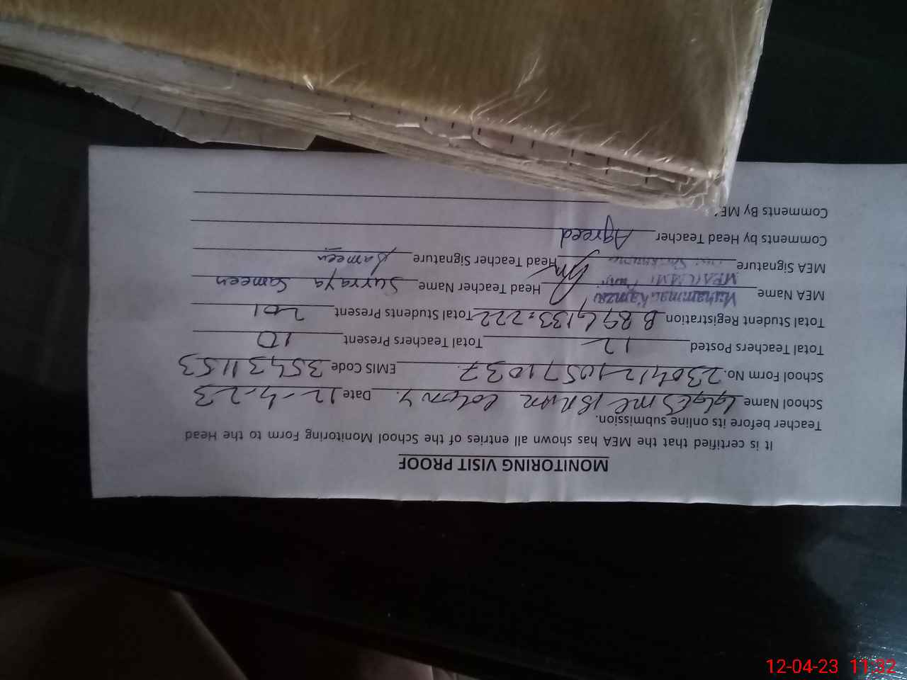 | Attendance Register | Head Teacher | MEA with School | Visit Proof |