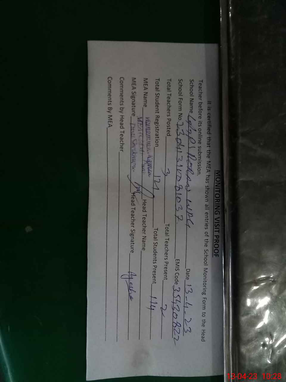| Attendance Register | Head Teacher | MEA with School | Visit Proof |