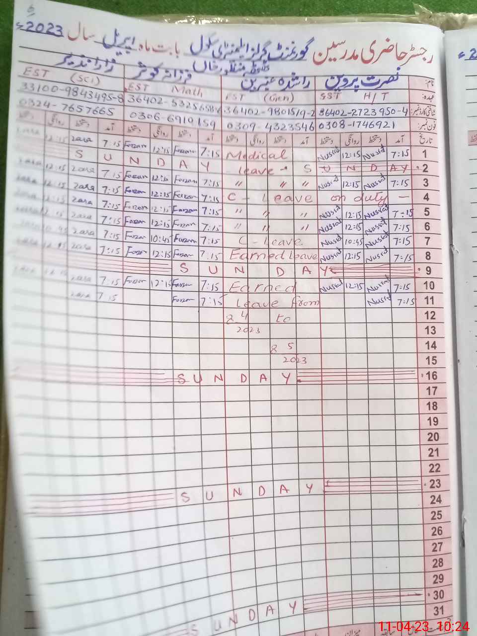 | Leave | Duty | Absent | Maternity | Medical | Ex- Pak |