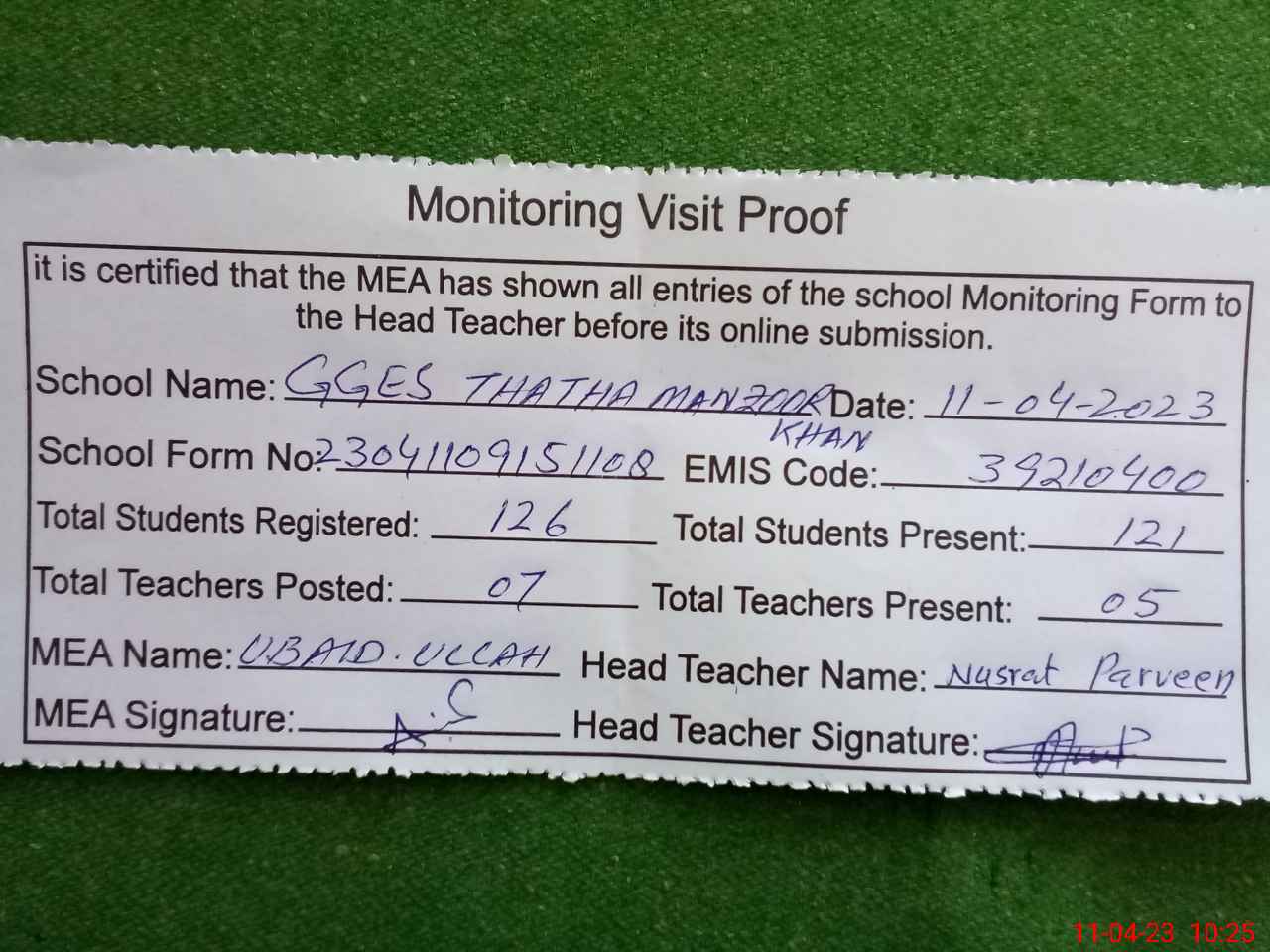 | Attendance Register | Head Teacher | MEA with School | Visit Proof |