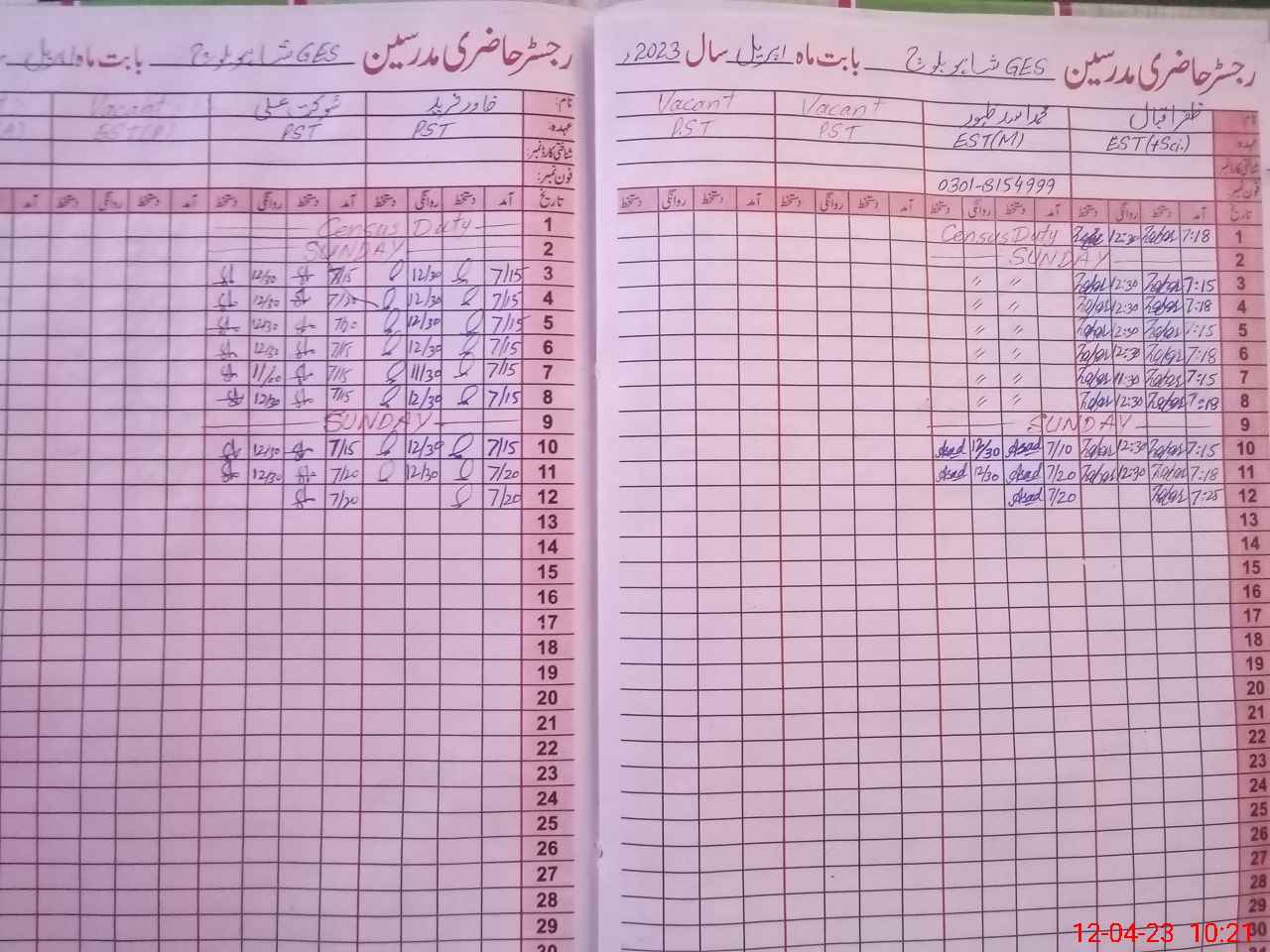 | CNIC | Full Name | Designation | R/C | Absence During Last Calender Month |