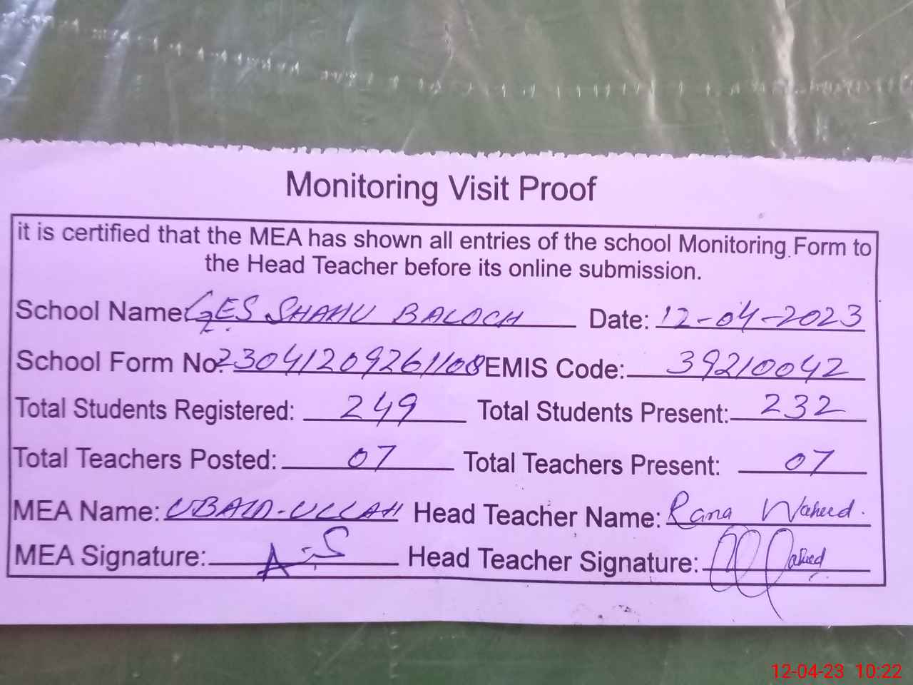 | Attendance Register | Head Teacher | MEA with School | Visit Proof |