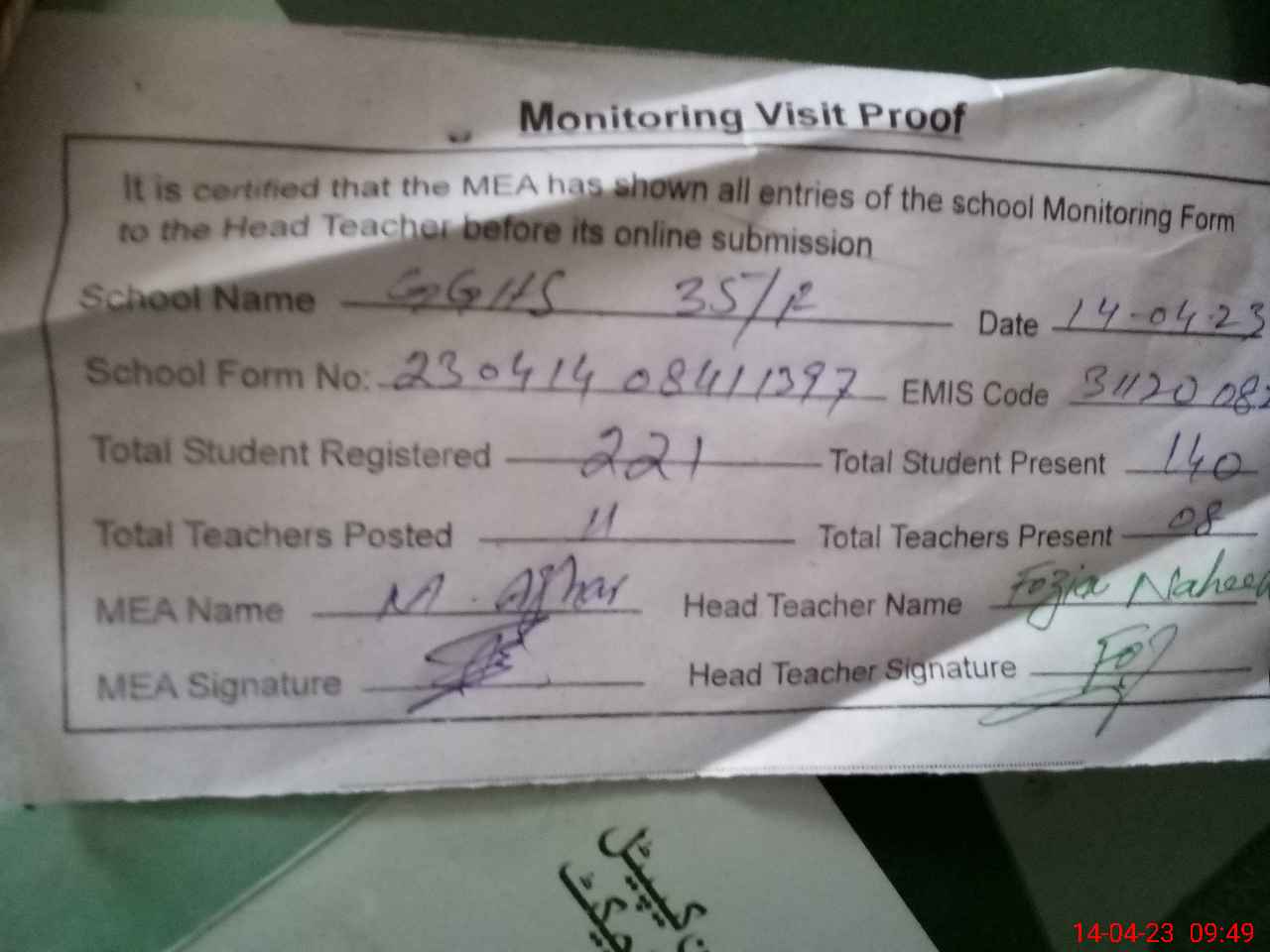 | Attendance Register | Head Teacher | MEA with School | Visit Proof |