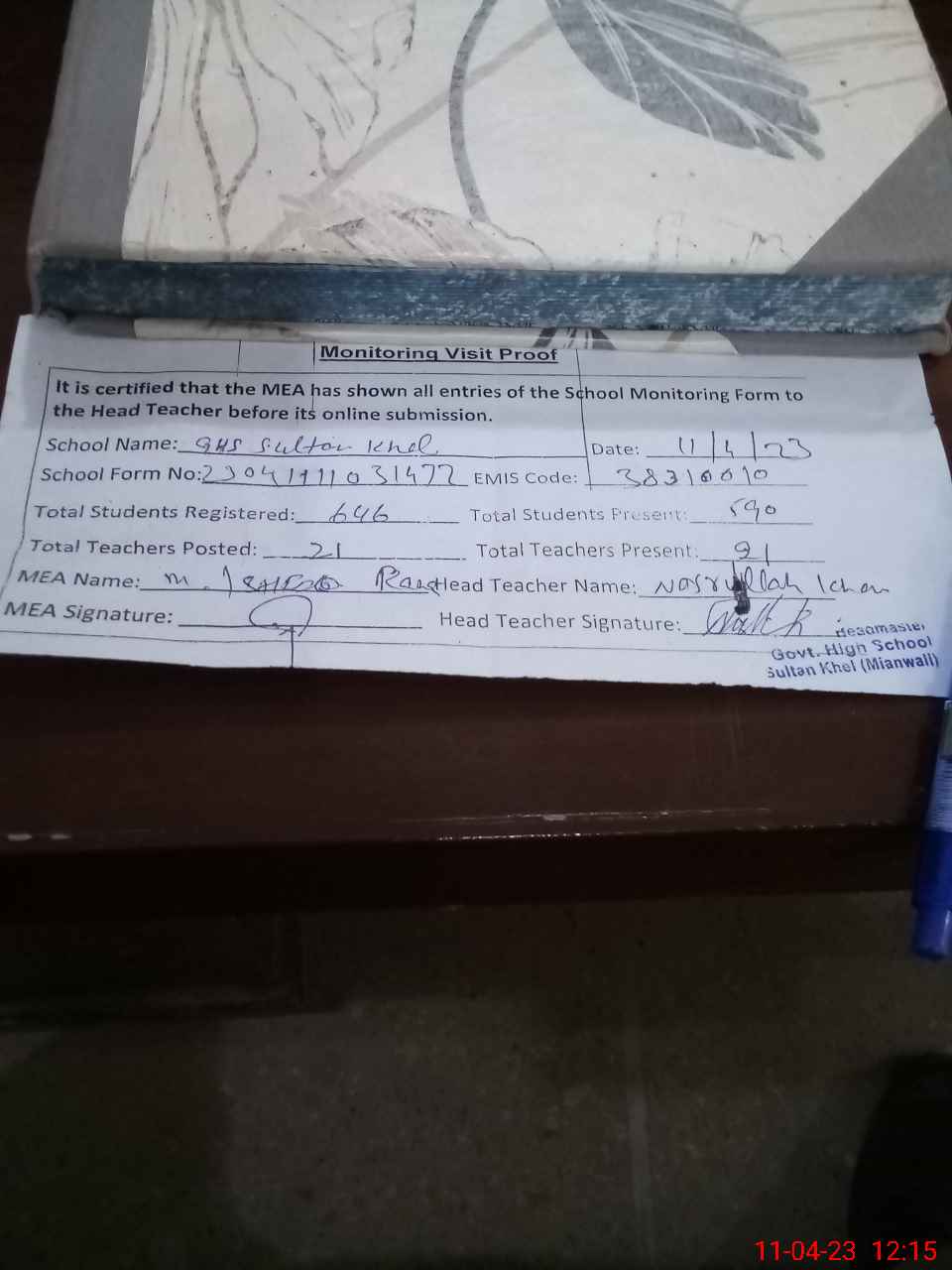 | Attendance Register | Head Teacher | MEA with School | Visit Proof |