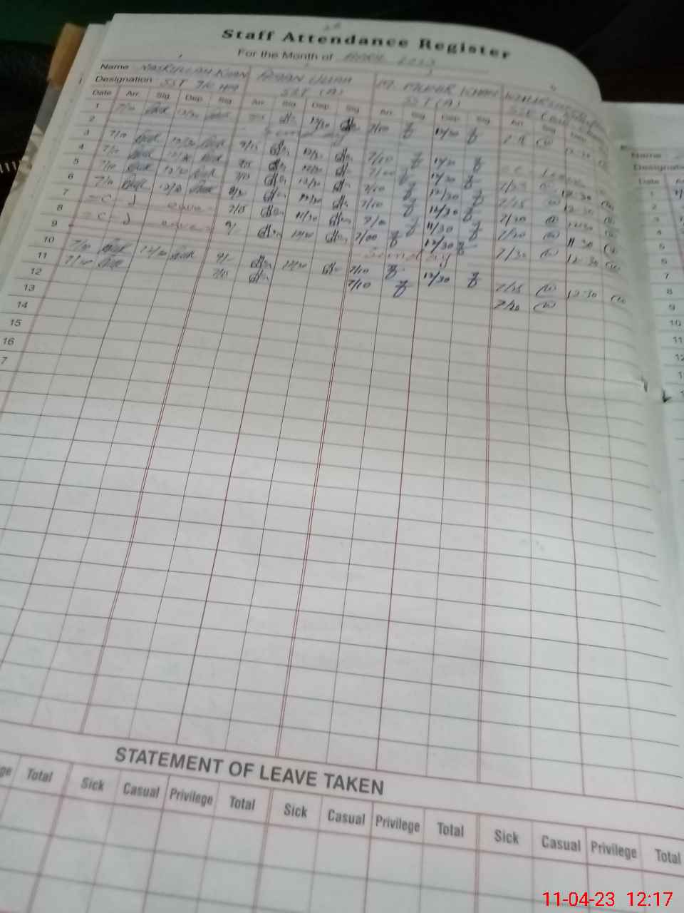| CNIC | Full Name | Designation | R/C | Absence During Last Calender Month |