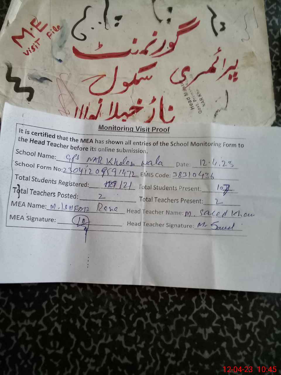 | Attendance Register | Head Teacher | MEA with School | Visit Proof |