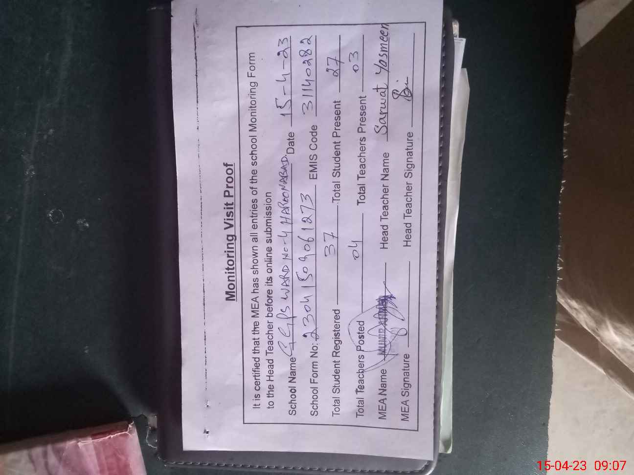 | Attendance Register | Head Teacher | MEA with School | Visit Proof |