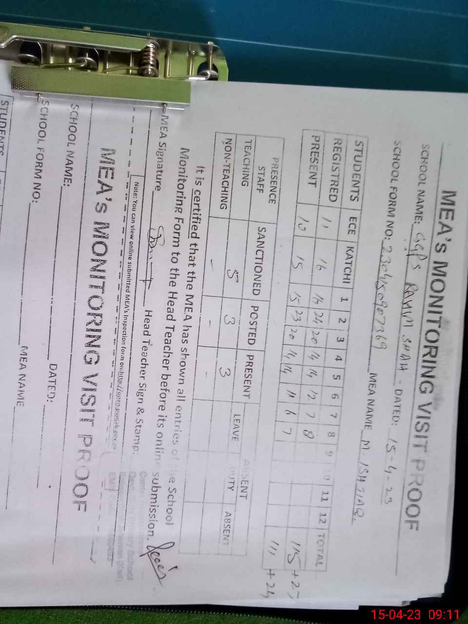 | Attendance Register | Head Teacher | MEA with School | Visit Proof |