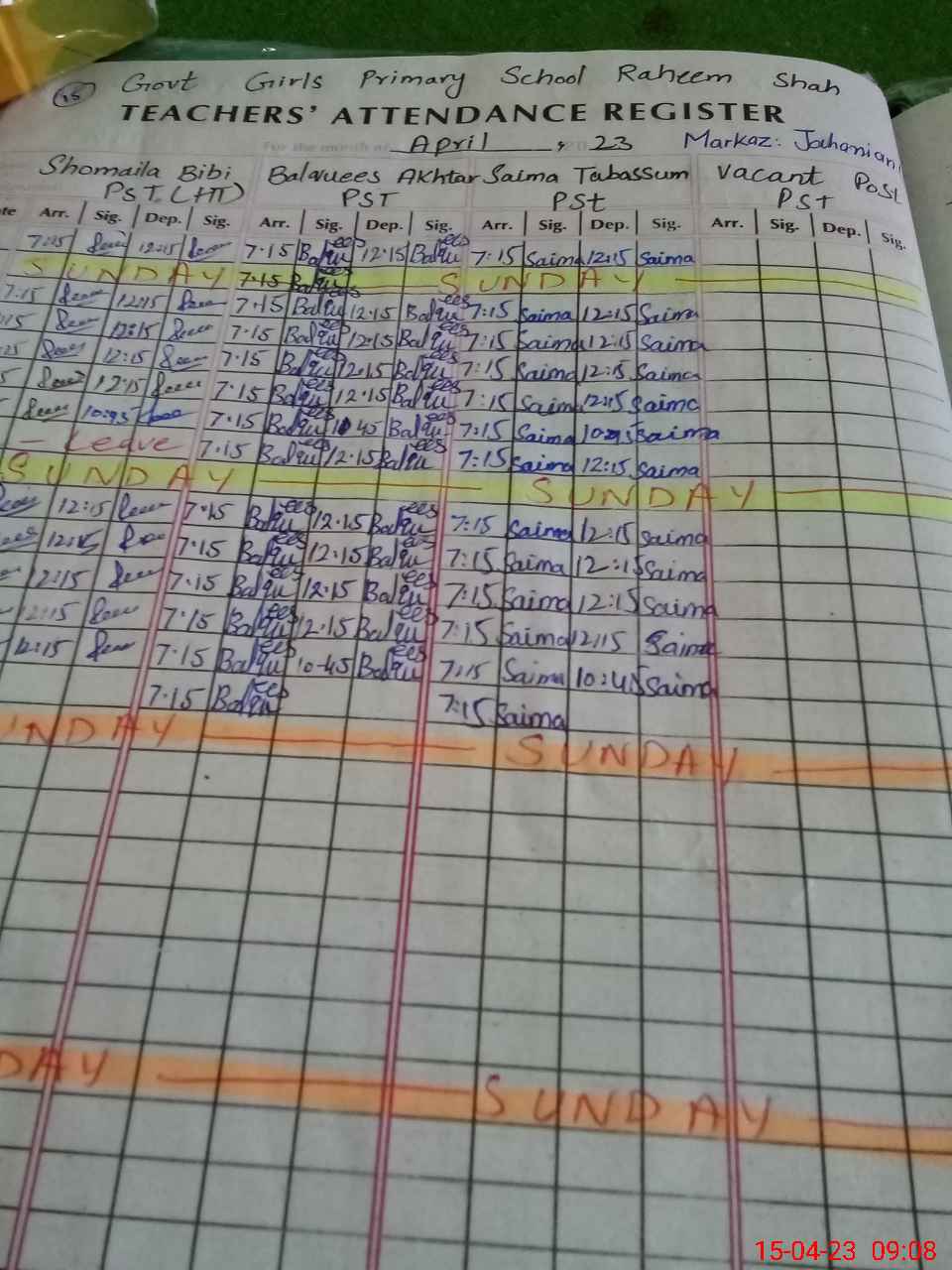 | CNIC | Full Name | Designation | R/C | Absence During Last Calender Month |