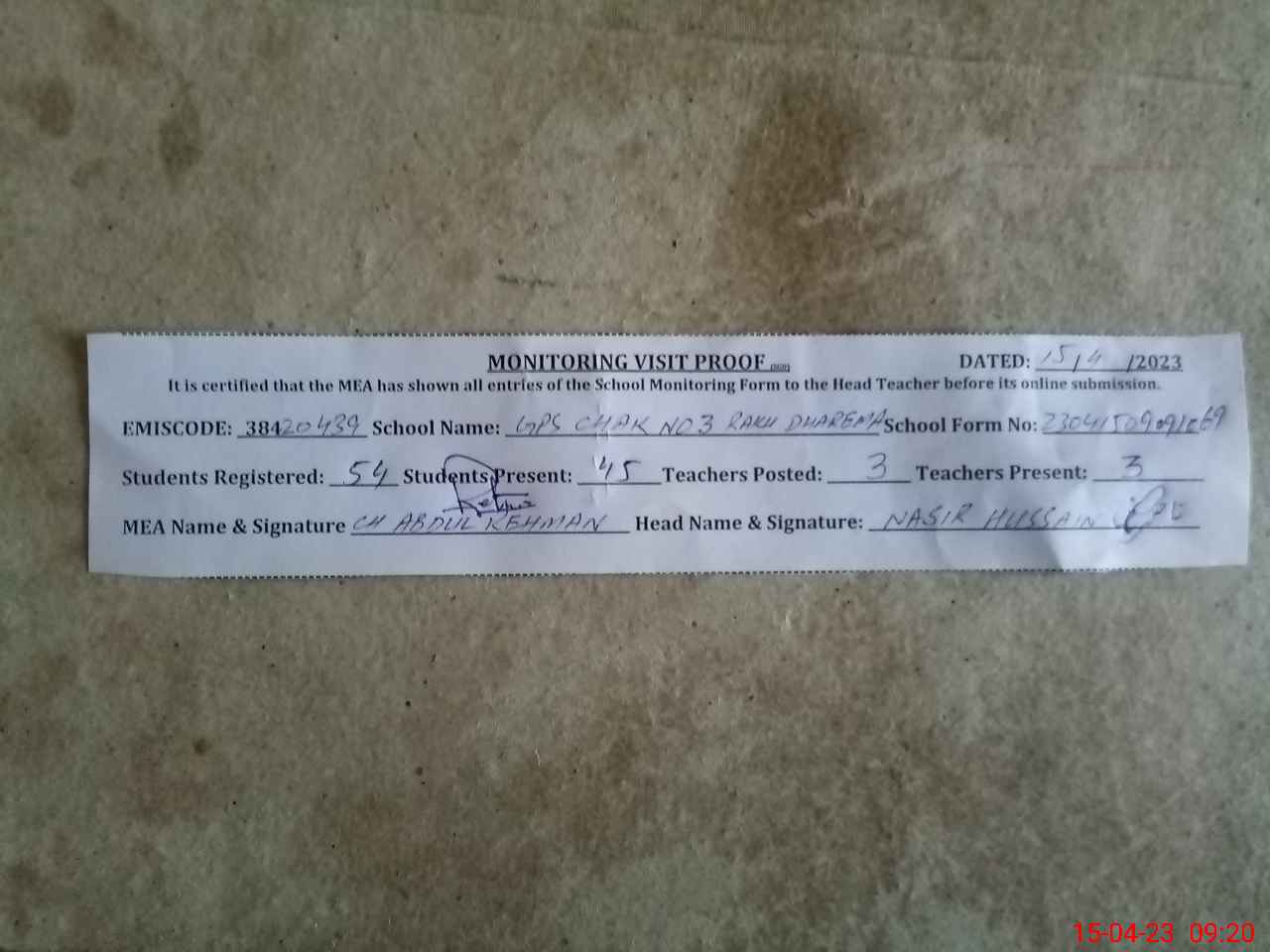 | EMIS Code: 38420439 | Name of School: GPS CHAK NO.3 RAKH DHAREMA | |||
