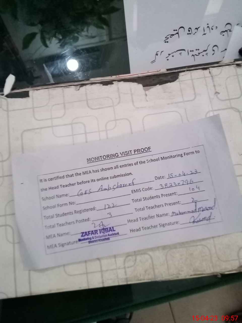 | Attendance Register | Head Teacher | MEA with School | Visit Proof |