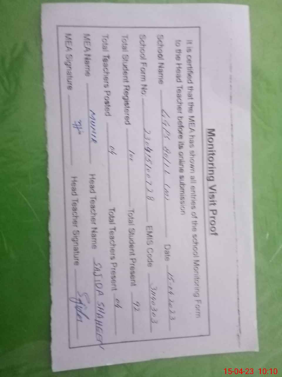 | Certified that this School was Inspected by the Undersigned MEA/DMO Today and the Information Stated Above is as Per Record. | |||||