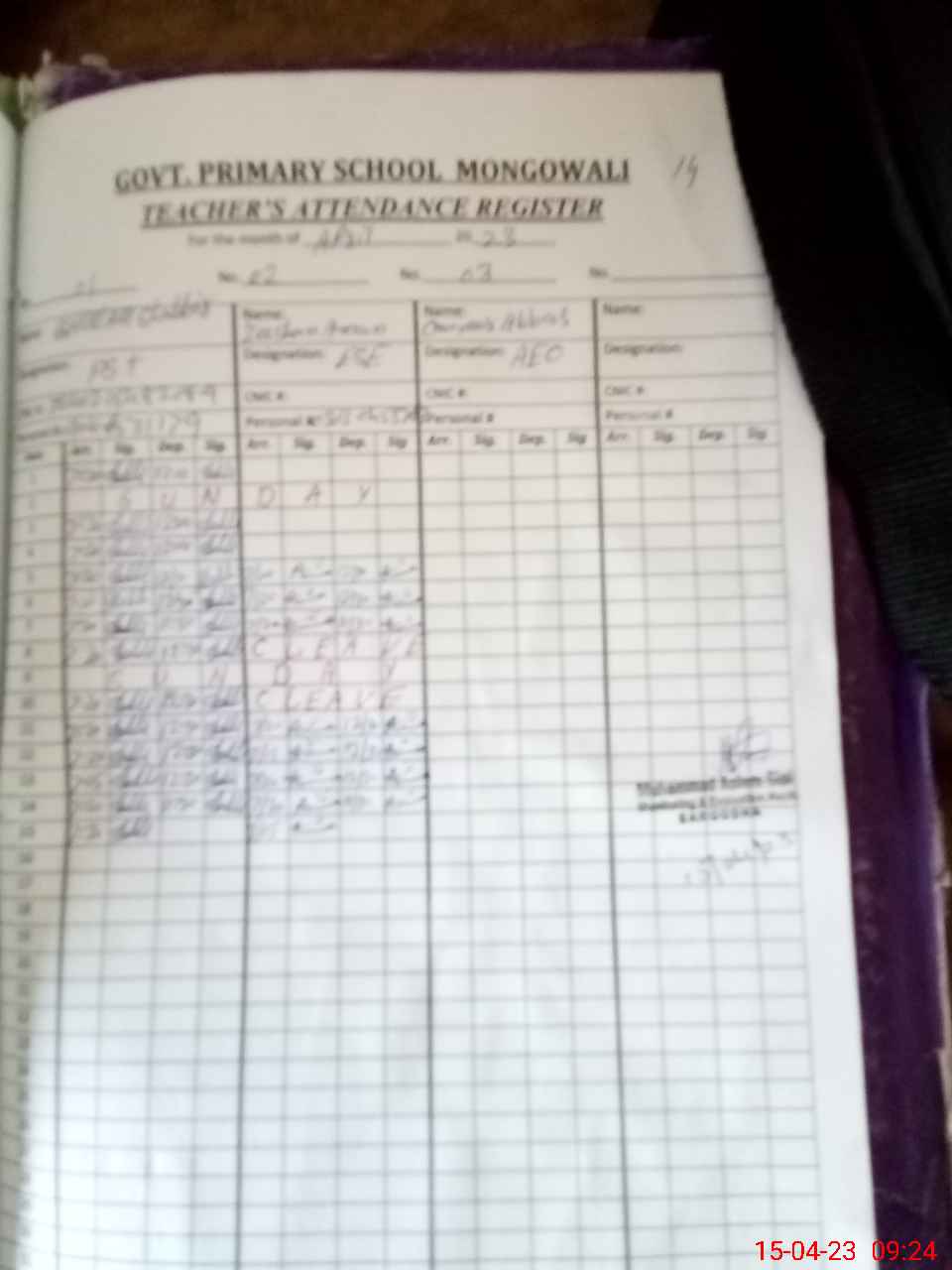 | CNIC | Full Name | Designation | R/C | Absence During Last Calender Month |