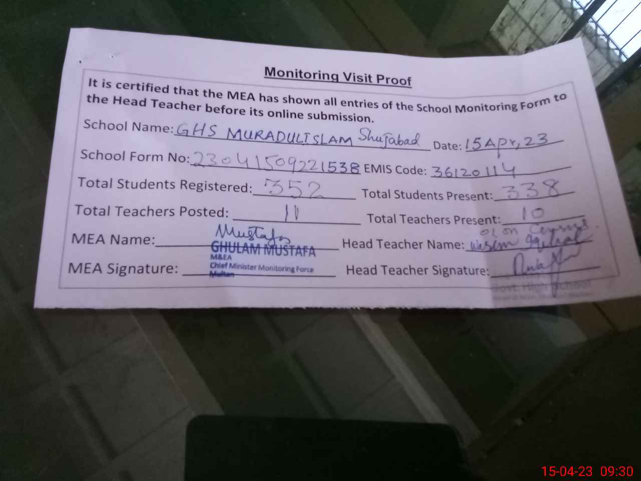 | Monitoring Date: 15-04-2023 | Start Time: 15-04-2023 09:01 AM | End Time: 15-04-2023 09:34 AM | Name of MEA: Gh**** Mu**** | |