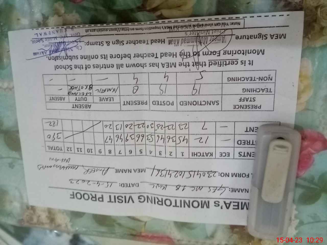 | Attendance Register | Head Teacher | MEA with School | Visit Proof |