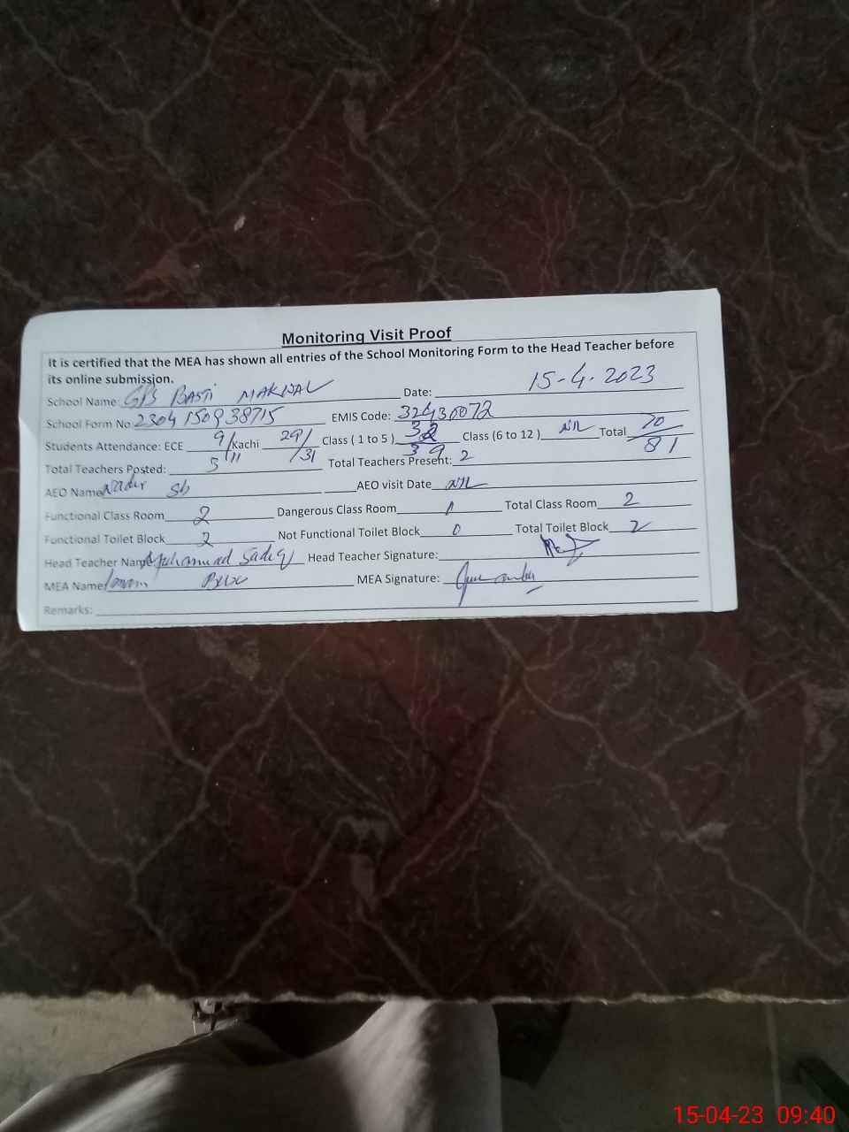 | Attendance Register | Head Teacher | MEA with School | Visit Proof |