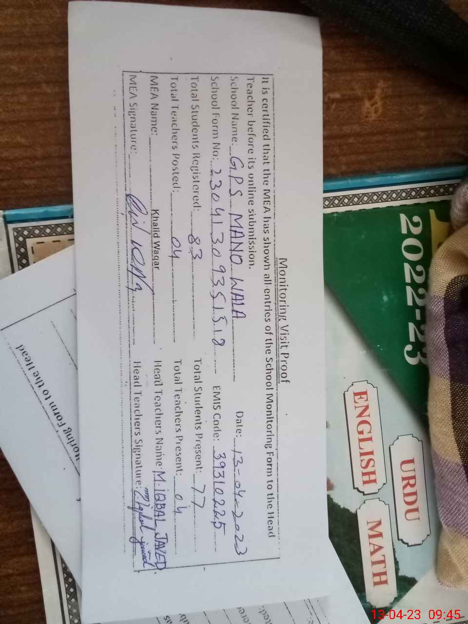 | EMIS Code: 39310225 | Name of School: GPS MANO WALA | |||