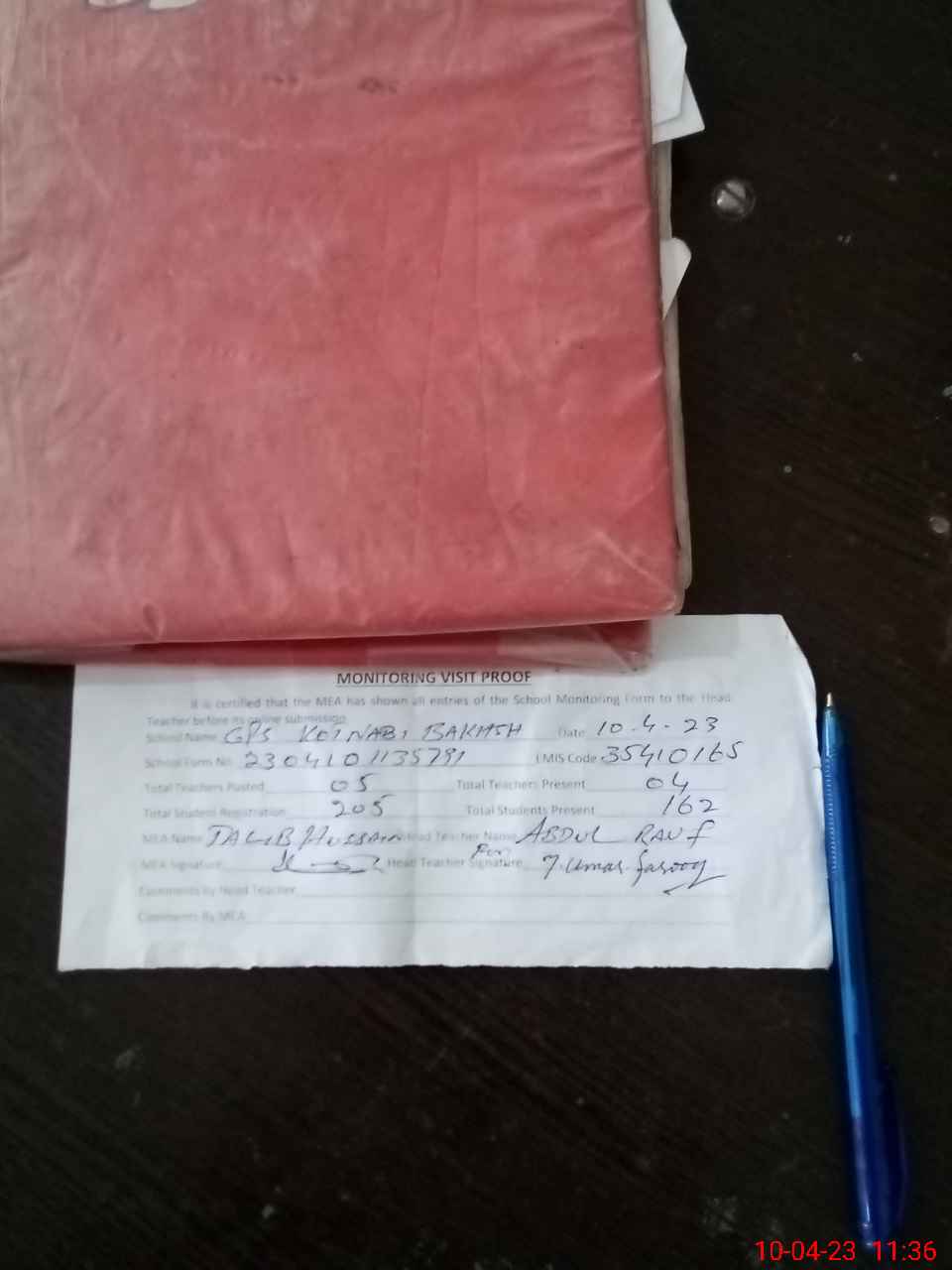 | Attendance Register | Head Teacher | MEA with School | Visit Proof |