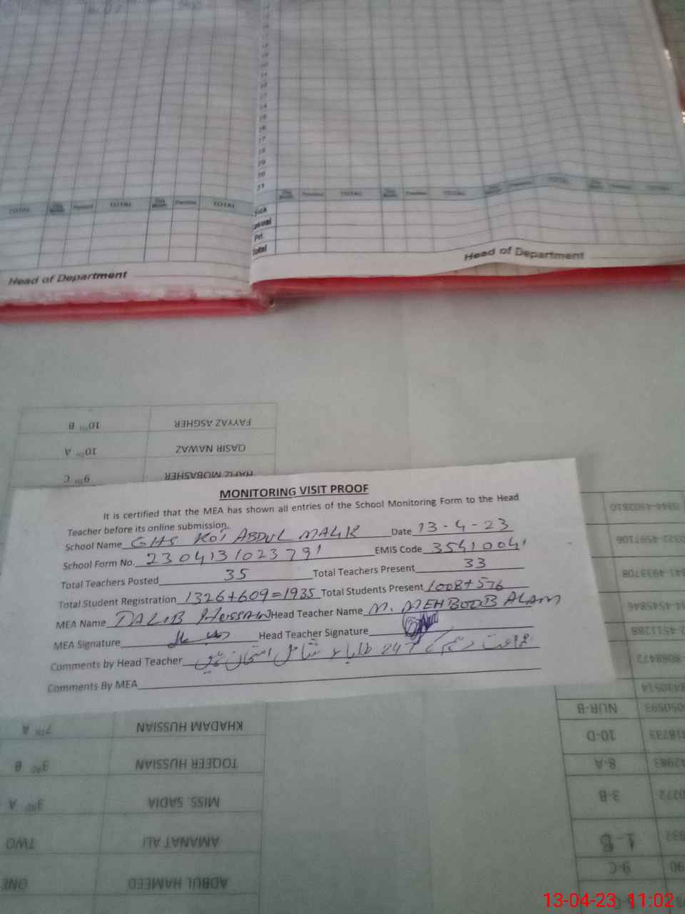 | Attendance Register | Head Teacher | MEA with School | Visit Proof |