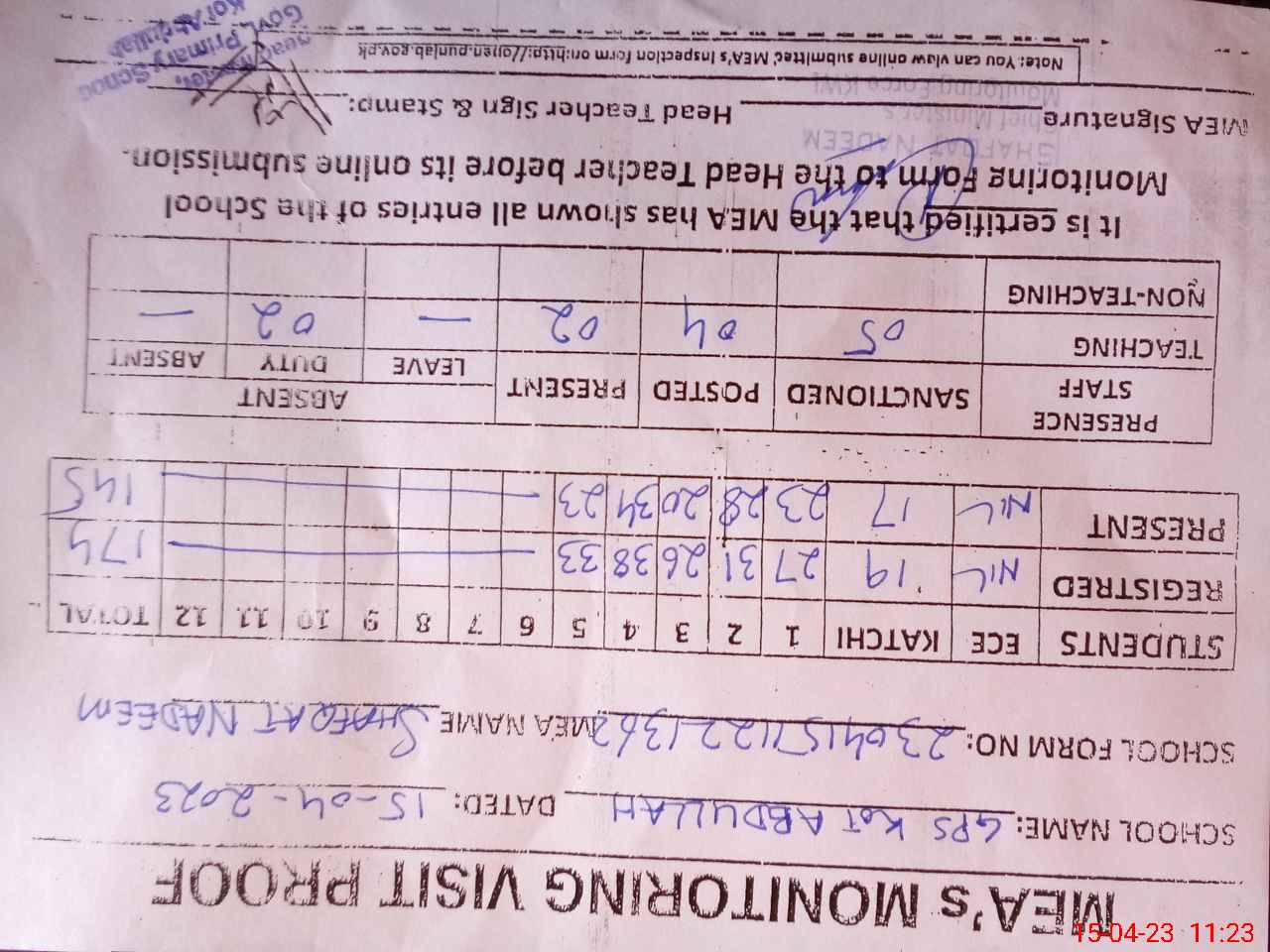| Attendance Register | Head Teacher | MEA with School | Visit Proof |